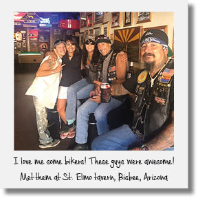 Bisbee is another 23 miles further south. Bisbee is a must visit! Our first stop was at the St. Elmo Bar (36 Brewery Ave.). The cool bikers, colorful locals, and spunky bartender, Kristin, made this a great stop. The margaritas were big, made with fresh lime juice, and most delicious! We had a great time hanging out at the Elmo. Next stop in Bisbee was Room 4 in the Silver King Hotel (43 Brewery Ave.). Room 4 claims to be the smallest bar in Arizona. I think they are selling themselves short. It has got to be one of the smallest bars anywhere! The three bar stools could not even accommodate the four of us. The pint sized bar is a must go for bucket list bar fans. For dinner we ate down the street at Santiago's (5 Howell Ave.). The food there was great, with delicious entrees big enough for two. After dinner we all boarded the aircraft carrier and headed on back to Phoenix.